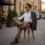 Sitting on a chair, crossed legs, blazer on shoulders. Chelsea boots for semi-formal events.Medium messy waves.Chinos with a polo shirt or fitted button-down, paired with loafers or sneakers.